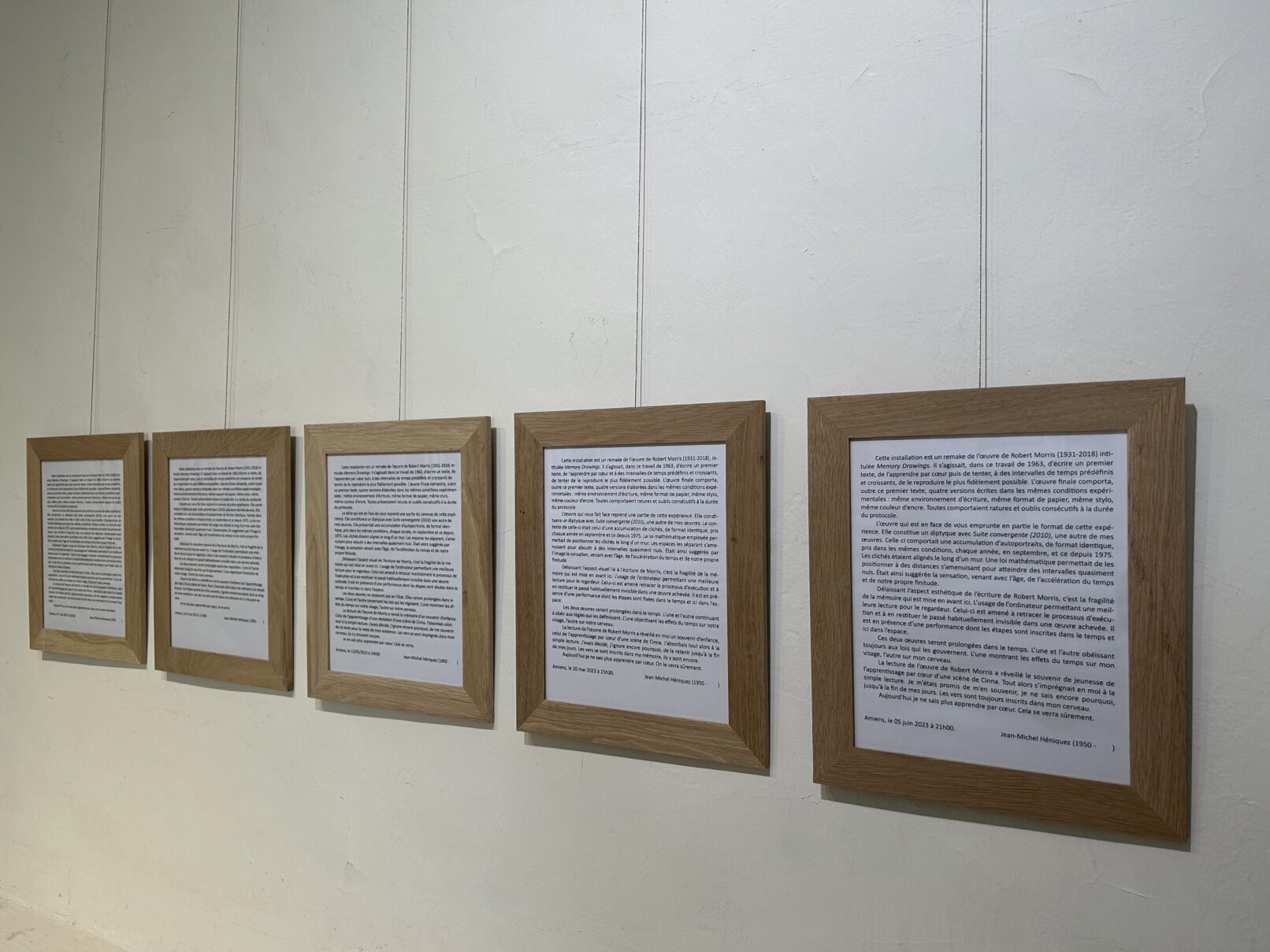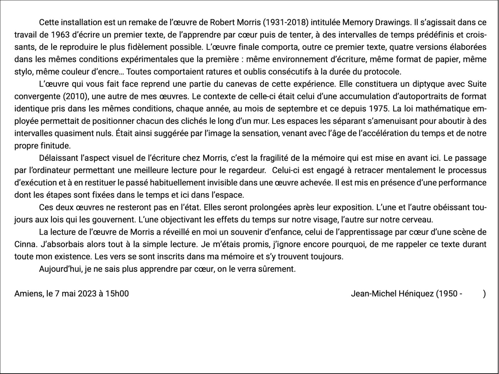 L’ensemble devant vous est composé de cinq textes. Tous exécutés suivant la même procédure. Le 7 mai 2023 à 15h00 j’écris le premier que je m’efforce de mémoriser. J’utilise ensuite une loi mathématique, la même que j’ai employée pour Suite géométrique, œuvre de 2010. L’application de cette loi fixe la date des suivants : le 8 mai 2023 à 21h00, le 12 mai 2023 à 24h00, le 20 mai à 15h30 et le 5 juin à 21h00. Chacun de ces textes tente de restituer le texte initial sans jamais l’avoir relu.